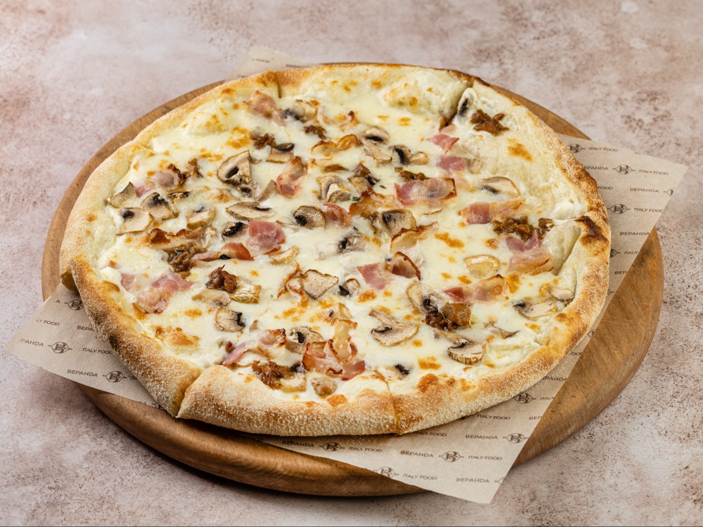 Шампиньоны, сыр, бекон, белые грибы