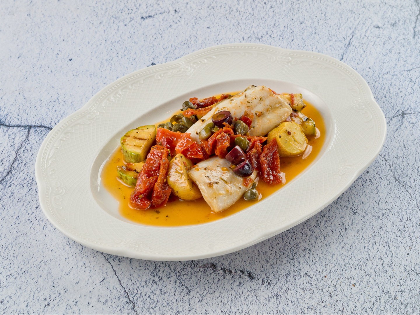 Камбала, оливки каламата, картофель бейби, томаты, цукини