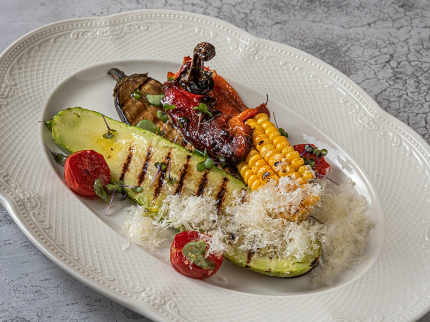 Кукуруза, кабачок, баклажан, болгарский перец, томаты, сыр монтазио