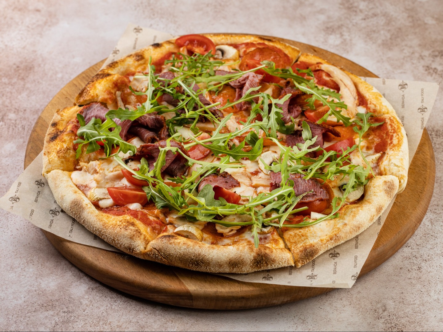 Пастрами из курицы, пастрами из говядины, салями, шампиньоны, сыр монтазио, моцарелла, страчателла, руккола