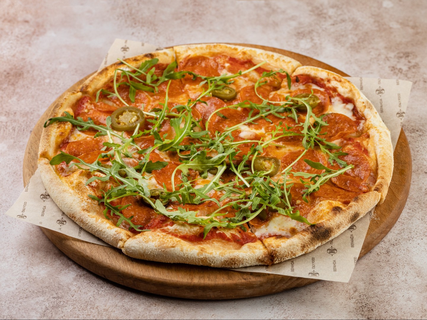 Соус неаполитанский, моцарелла, чоризо, острое масло, руккола