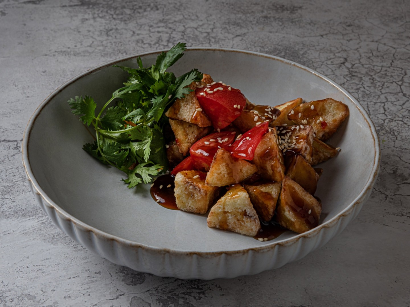 Баклажаны, томаты, кинза, соус тайский чили