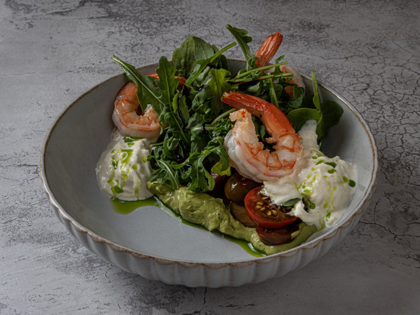 Креветки, руккола, томаты, страчателла