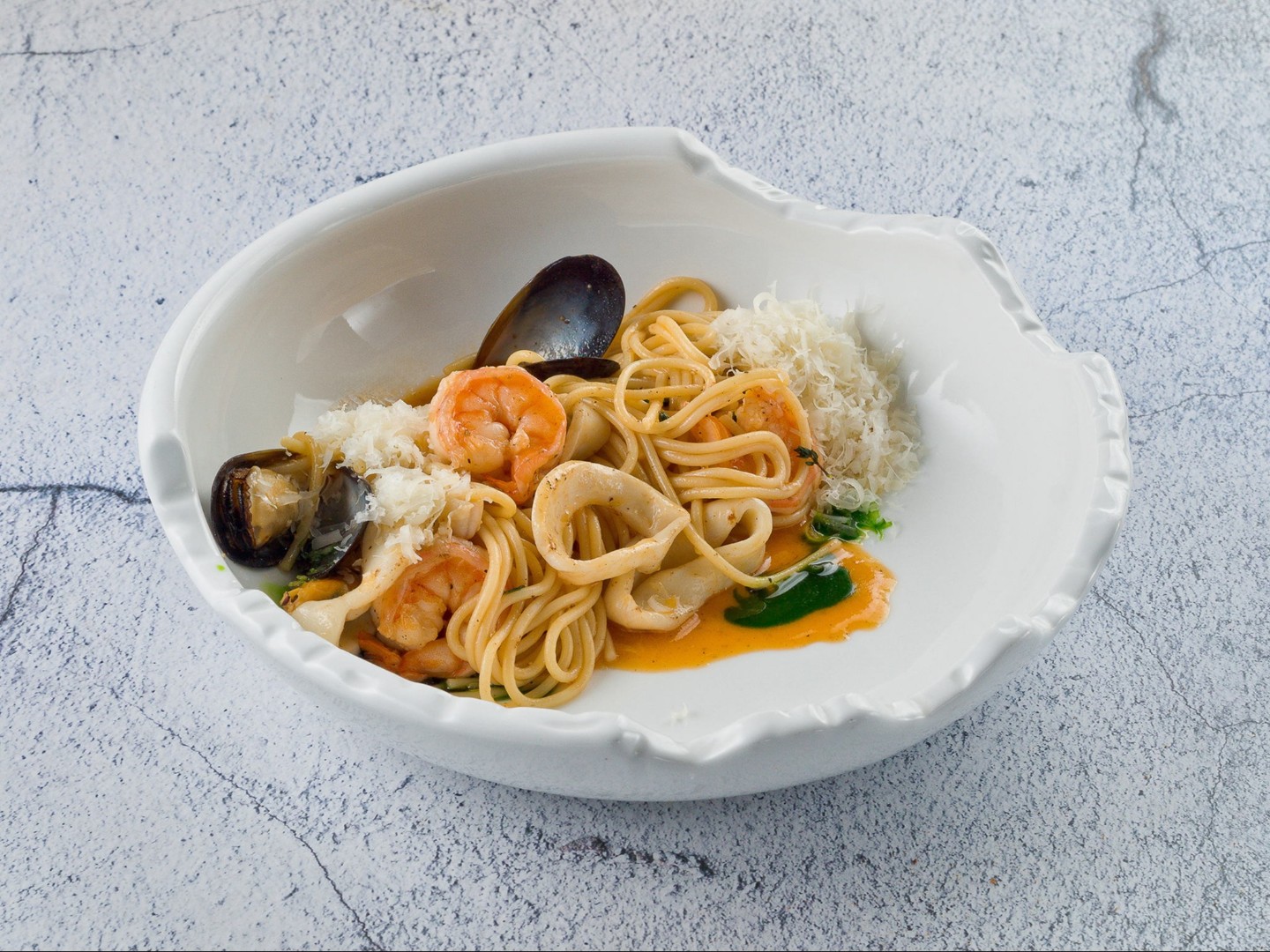Кальмар, мидии, креветка, пармезан, спагетти